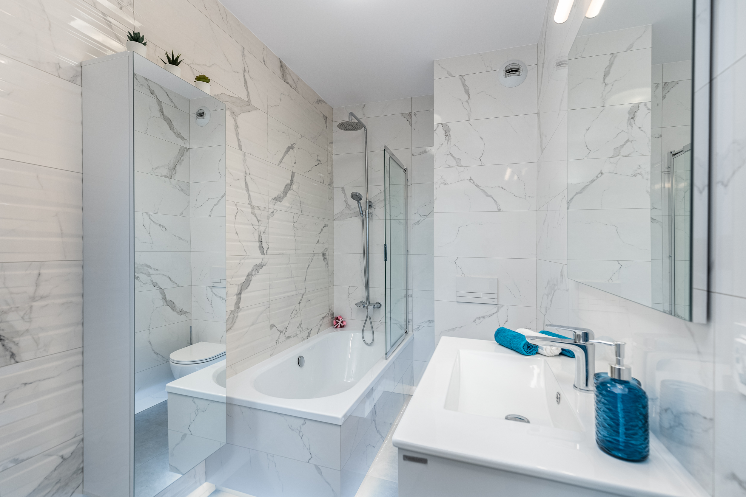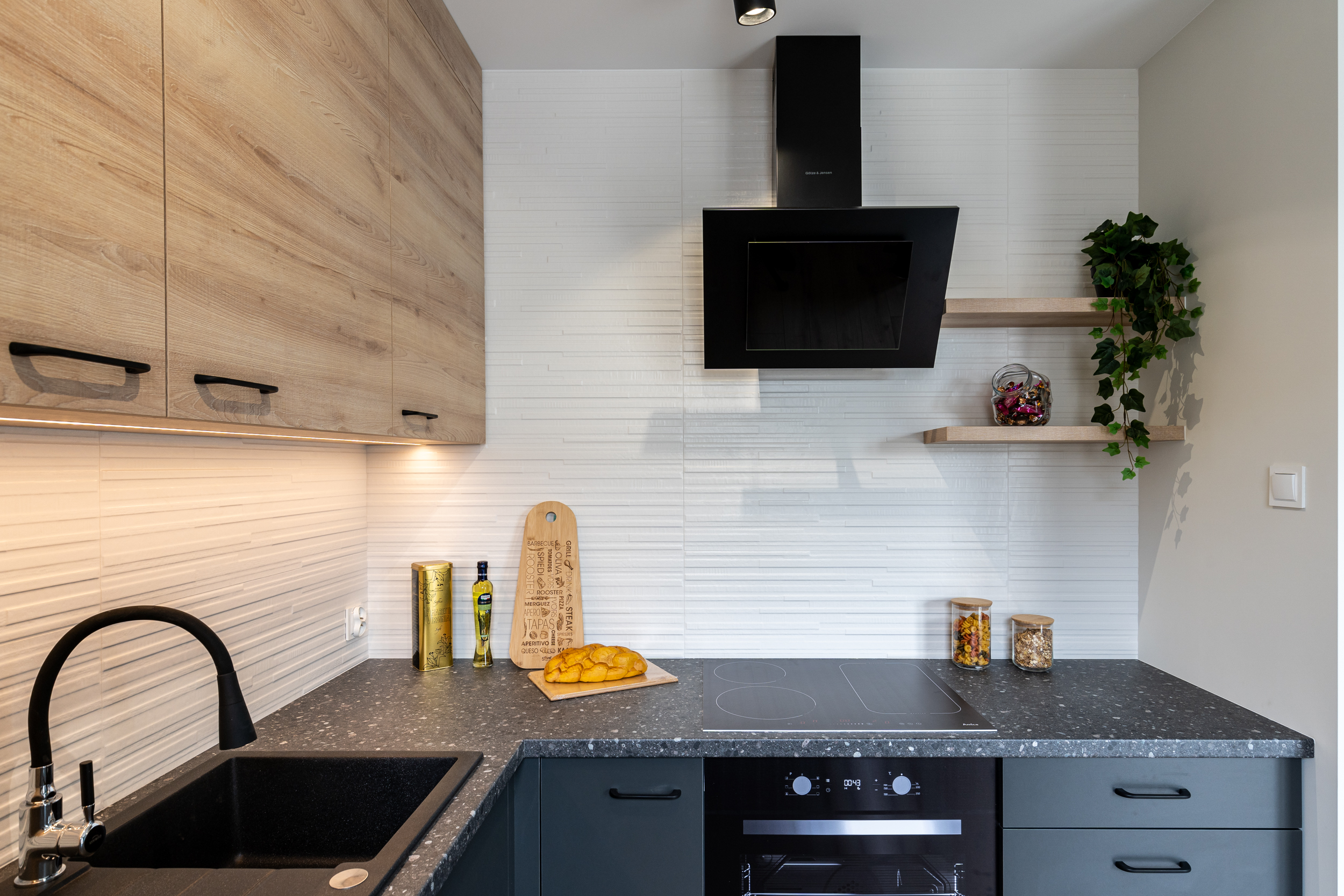 W łazience położone zostały wysokiej klasy włoskie płytki ze strukturą 3D, dodatkowo poprzez montaż oświetlenia LED można wykorzystać łazienkę do klimatycznego wypoczynku. W kuchni prócz narożnej zabudowy dodatkowo dodana została płyta kuchenna pełniąca zarówno funkcję stołu z którego mogą korzystać 2 osoby (+ ew. dziecko), jak również w razie potrzeby dodatkowego blatu roboczego do przyrządzania potraw.