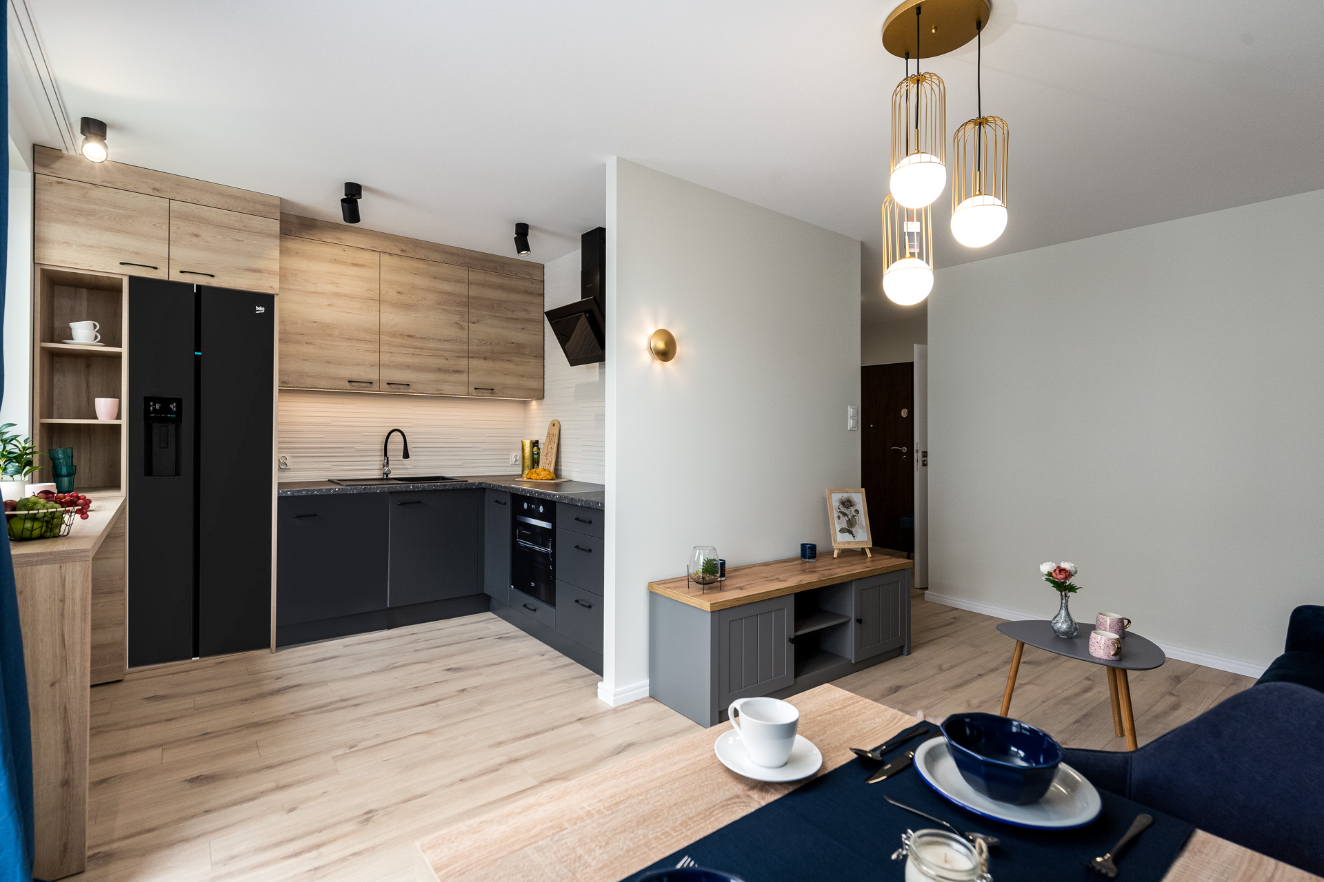 Mieszkanie o łącznej powierzchni 46 m2 zostało wykończone w układzie dwupokojowym (salon + sypialnia), z pół otwartą jasną kuchnią, garderobą oraz łazienką.